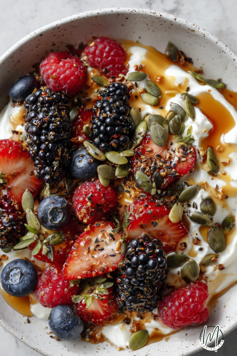 A classic Mediterranean breakfast that never disappoints. Creamy Greek yogurt forms the base, topped with fresh seasonal berries, a drizzle of honey, and a sprinkle of chopped chia seeds and pumpkin seeds. The result is a bowl rich in protein, probiotics, antioxidants, and omega-3 fats — everything your body needs to power through the morning.